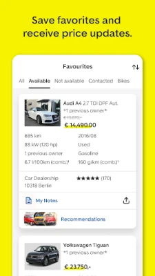 Pengalaman mencari kenderaan anda dipertingkatkan dengan ciri-ciri pintar AutoScout24. Manfaatkan penapis carian intuitif dan senarai simpanan untuk menyusuri pilihan dengan cekap. Tidak perlu risau terlepas peluang terbaik kerana anda akan menerima notifikasi segera mengenai penurunan harga, tawaran baharu, atau sebarang perubahan pada kenderaan kegemaran anda. Selami dunia kenderaan secara maya dengan AutoScout360°, yang membolehkan anda melawat dan meninjau setiap sudut kenderaan pilihan anda dari keselesaan rumah, menjimatkan masa serta membantu membuat keputusan yang lebih yakin. Anda juga boleh berkongsi penemuan menarik dengan rakan-rakan dengan mudah.